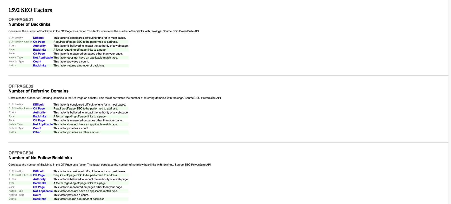 This file offers detailed explanations of all the factors analyzed for the query, which makes it easier to understand what each factor—sometimes with cryptic names—actually measures. It clarifies what a factor represents, how it is calculated, and whether it correlates with rankings or other factors.