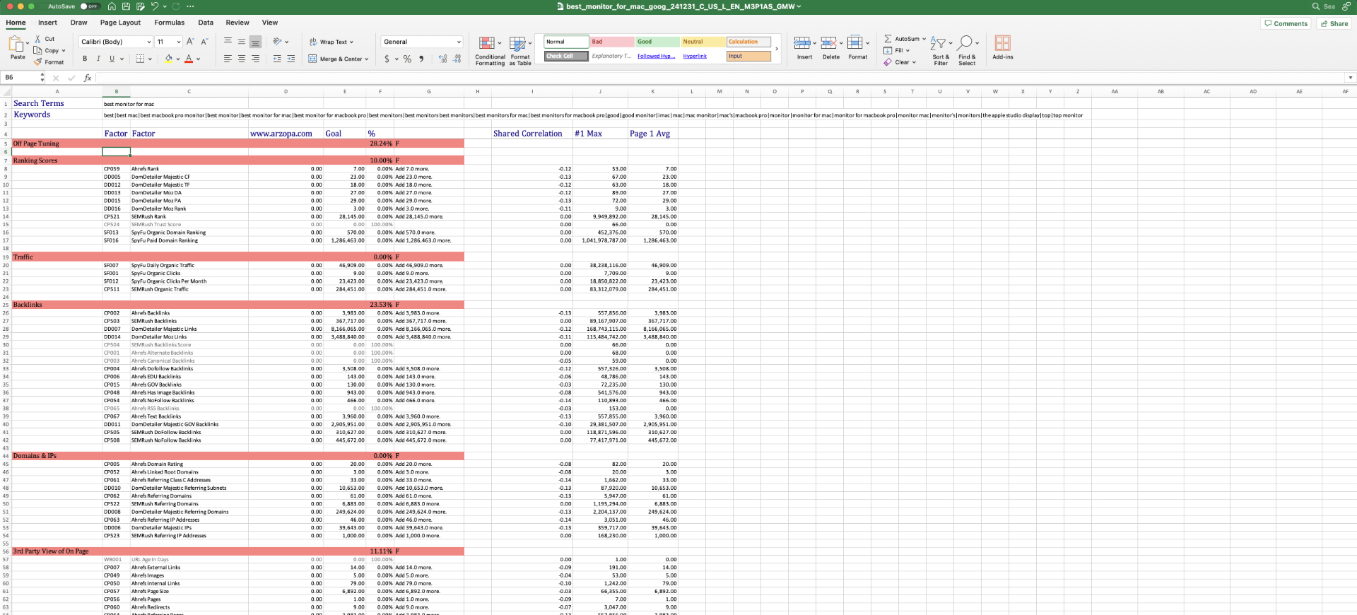 A Cora SEO audit report is more than just a data dump—it’s a detailed Excel workbook (also compatible with Google Sheets, minus charts) that compares your page to competitors in every critical area. It highlights content gaps, technical issues, and optimization opportunities using statistical correlation analysis.